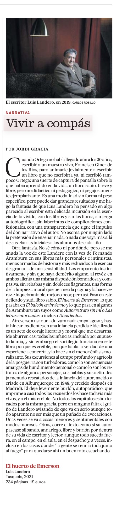 «Y lo que se dice para el artista sirve para todos los que quieran cultivar el arte de vivir. Así que ya sabéis: trabajad en lo concreto, en vuestro huertecito, buscad en vuestra memoria y en vuestros territorios cotidianos, sed fieles a vuestras ciegas marcas, y atended siempre a los requerimientos de vuestro corazón. Recordad lo que decía Cervantes: saber sentir es saber decir.»